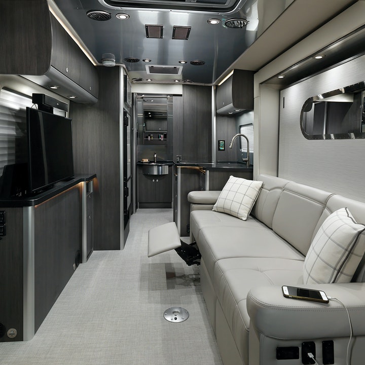 The Atlas is the first Airstream motorhome to include a power slide-out, and we’ve taken care to do it right. On the road, the slide-out is retracted and fits seamlessly with the luxury automotive body style. And at the campground, it extends with the touch of a button on the Multiplex control panel. Once extended, you have more room to relax on the couch or pull down the Murphy bed to turn in for the night.