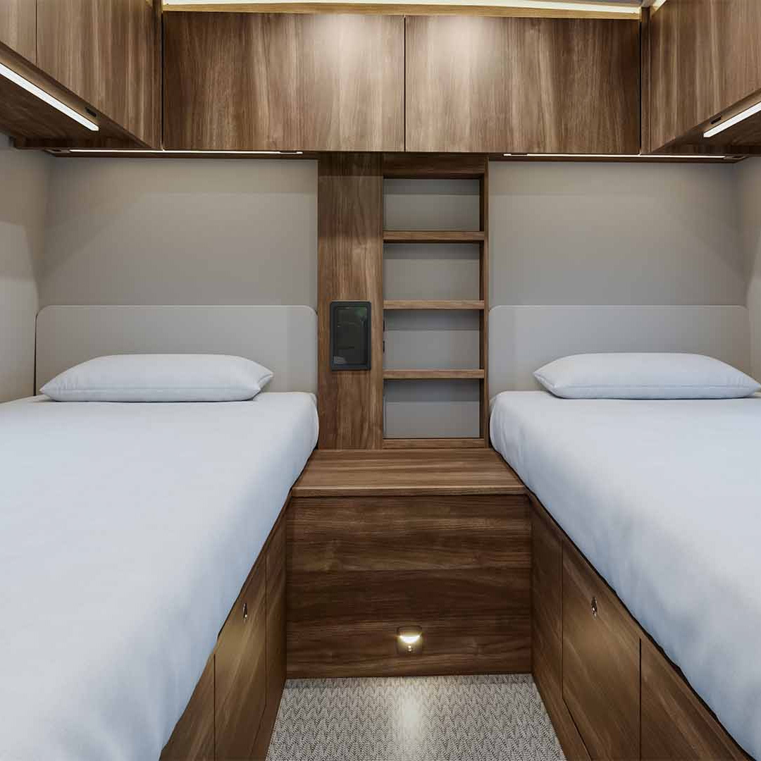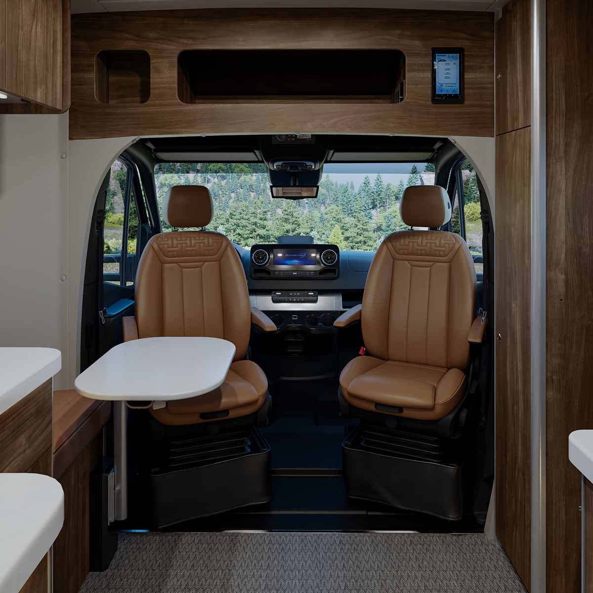 The Atlas is the first Airstream motorhome to include a power slide-out, and we’ve taken care to do it right. On the road, the slide-out is retracted and fits seamlessly with the luxury automotive body style. And at the campground, it extends with the touch of a button on the Multiplex control panel. Once extended, you have more room to relax on the couch or pull down the Murphy bed to turn in for the night.