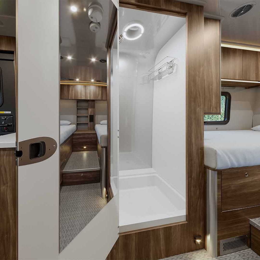 The Atlas bathroom is a stand-out. Behind a pocket door is a three-piece, residential-style layout that spans the rear of the coach. The shower features teak inlays and Kohler® stainless steel fixtures, and a tankless water heater provides as much continuous hot water as you like. Plus, hanging closet storage and drawers for your folded clothes all live inside the bathroom, so everything you need to get dressed and ready is in one place.