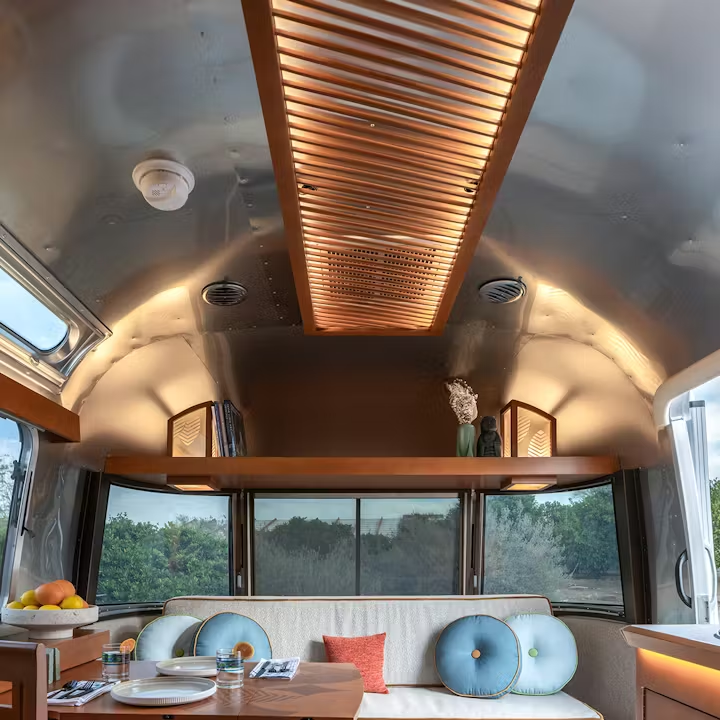 Thoughtfully designed with dual-purpose elegance woven throughout the trailer. Twin beds glide into a king, the dinette and desk fold seamlessly into custom cabinetry, and the sofa converts into a serene secondary place to sleep - each adapting seamlessly from day to night, work to rest.