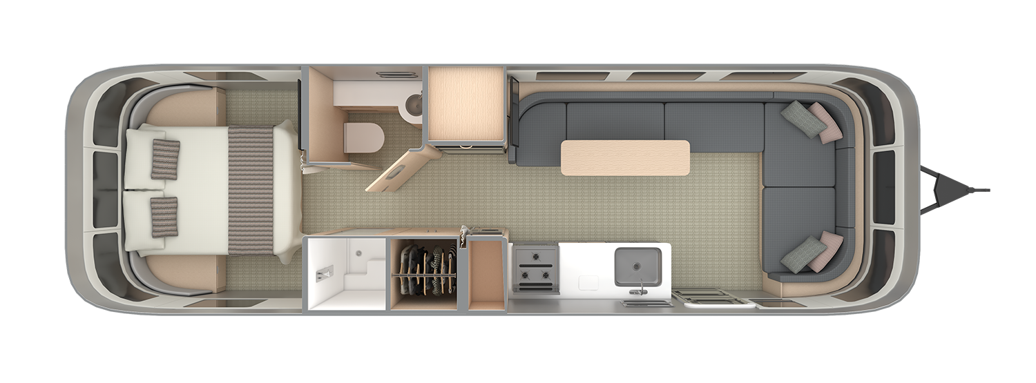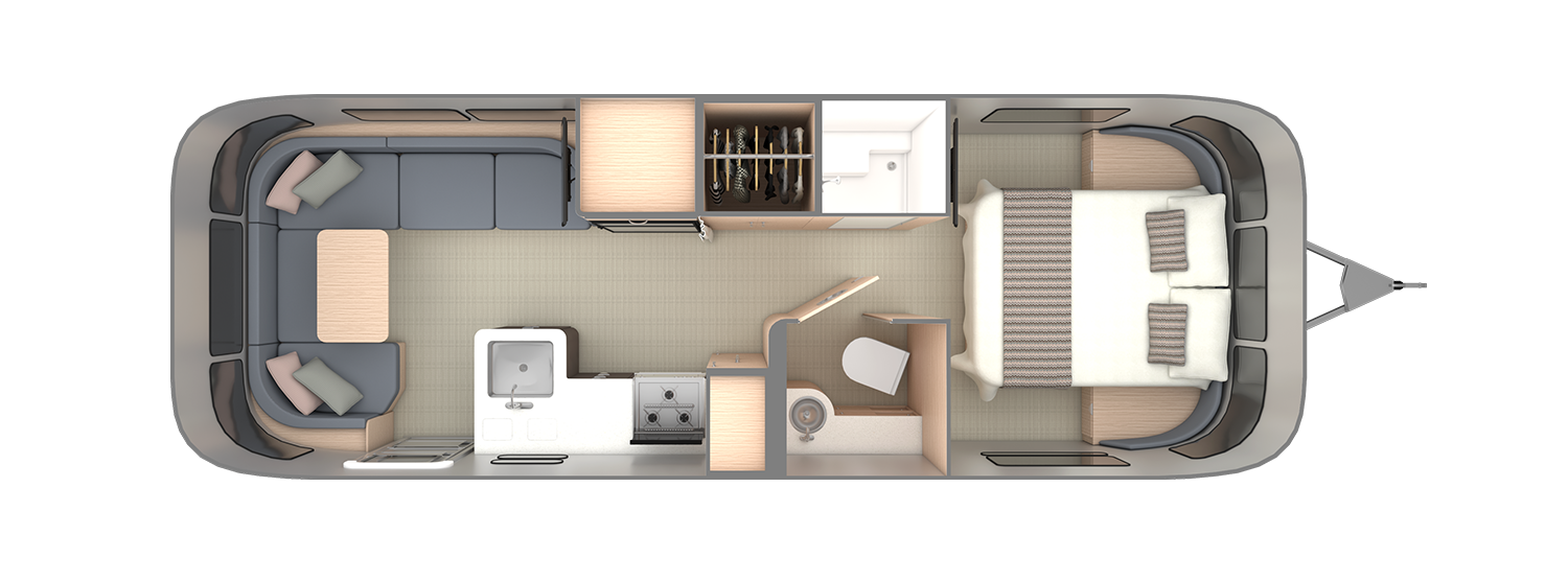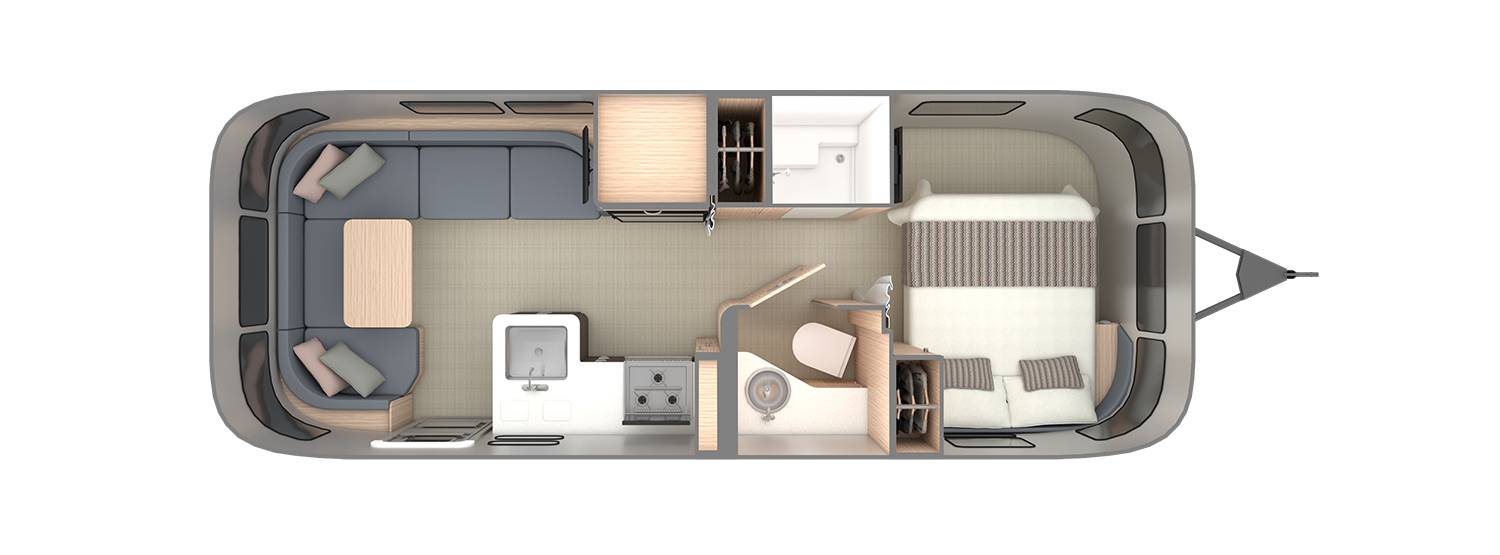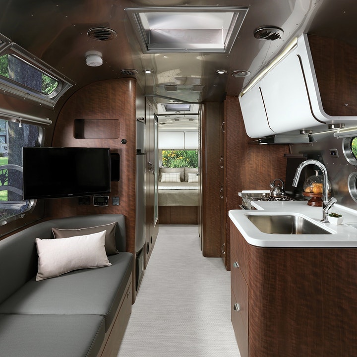 A concept born in the UK and influenced by design from all across Europe, the Globetrotter's interior is a thing of beauty. The crisp, clean lines, smart compositional elements and lustrous aluminum walls work in perfect harmony with the iconic Airstream profile. The Globetrotter comes in eight spacious floor plans. Choose between a queen bed or twin beds in the front or rear of the travel trailer.